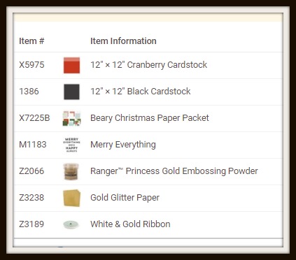 The sentiment is heat embossed with Princess Gold Embossing Powder and matted with Gold Glitter paper, the White & Gold Ribbon is added to make the sentiment look like a present. The plaid paper is from the Beary Christmas paper pack.
