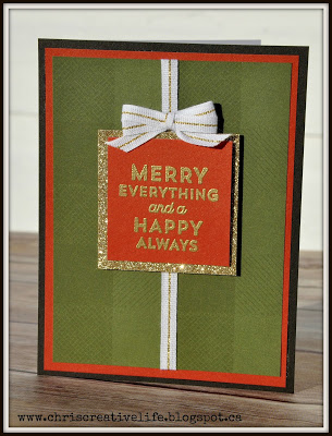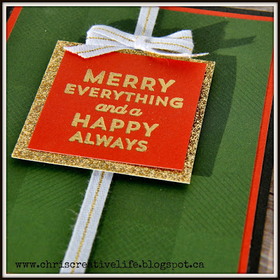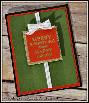This is a quick and easy card that look like a present!! The sentiment is one of the super cute small sentiment stamps from the Holiday Expressions Idea Book called Merry Everything. I love that those like M sized stamped can be switched out for a different look or message.