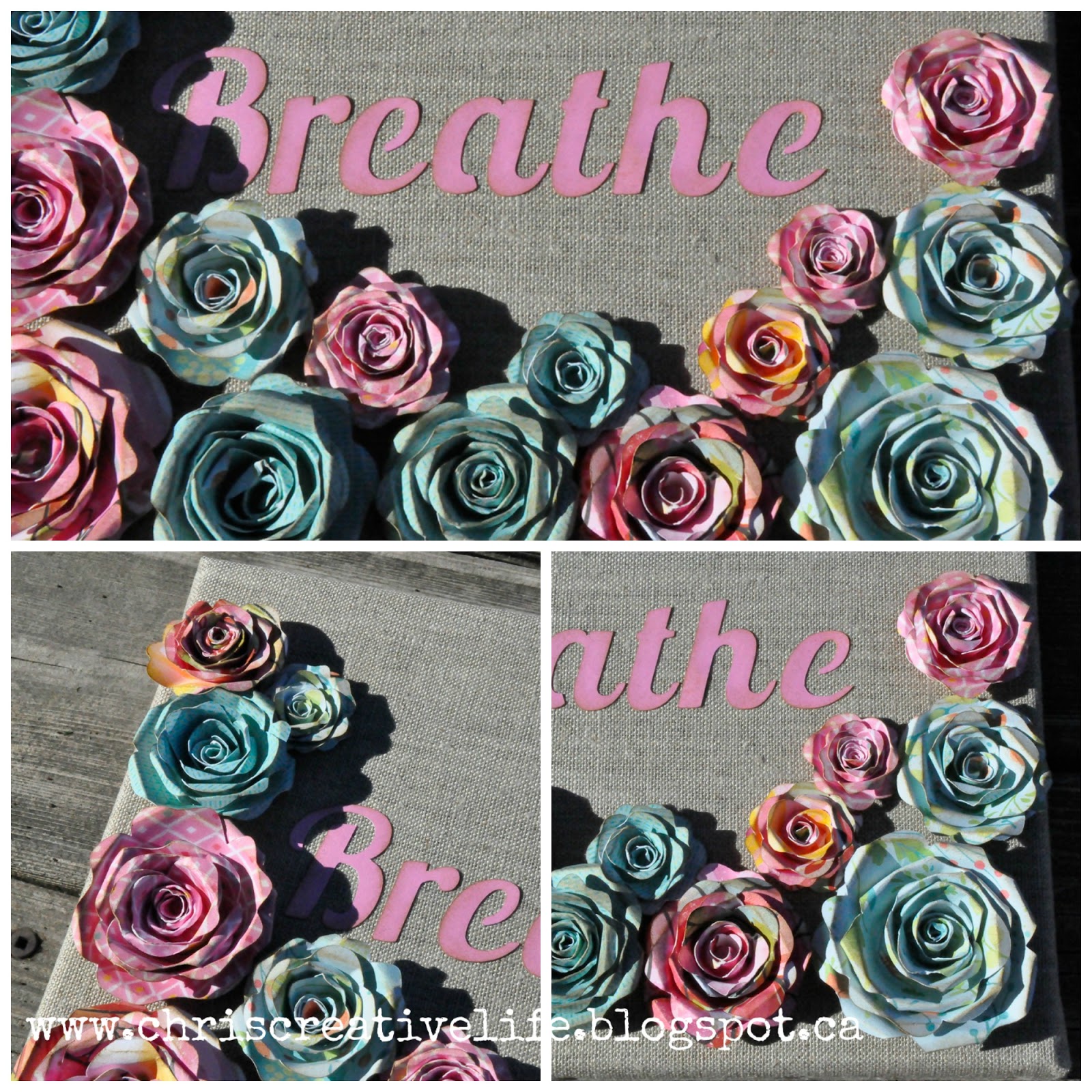 I found this super cute linen canvas and thought it would make a great place to start with this project. Then I create flowers in various sizes with the Cricut Art Philosophy cartridge and a title from the Cricut Artfully Sent cartridge. I thought that the Blossom and Blushed papers were a lovely complement to the linen canvas.