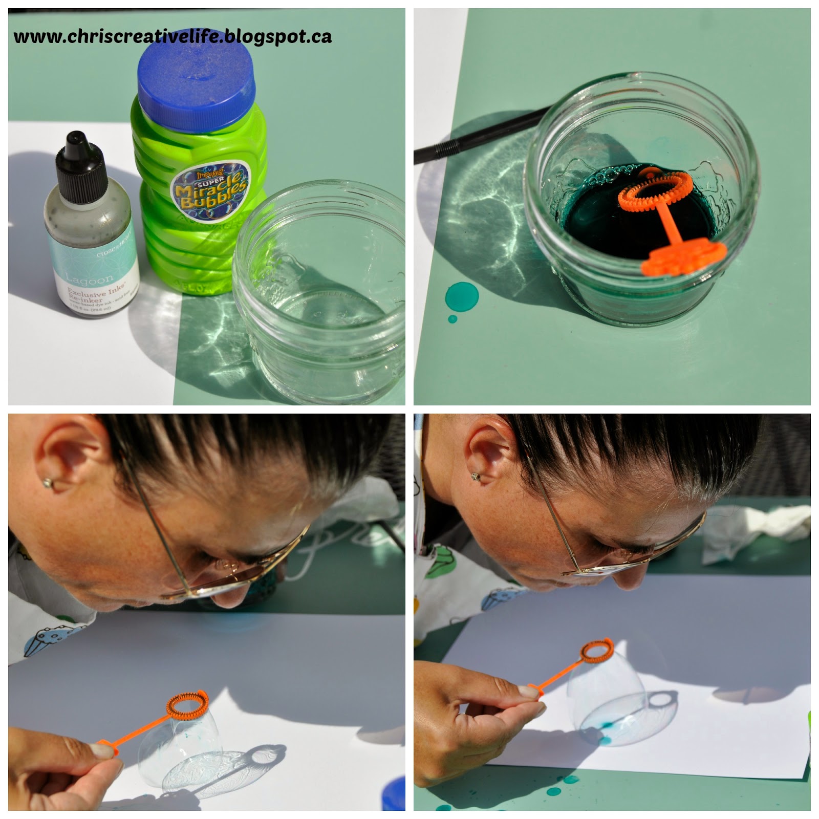 I decided to try something new and fun that I had never tried before- Re-inker bubbles. I love bubbles always have!! When the kids were little I had a bubble machine that we used to set up in the back yard every time they went out to play. This was super easy and fun. I started with a covered surface (outside) as it can get a bit messy. In a small glass jar I mixed re-ink (Lagoon) and bubbles, mixed them.