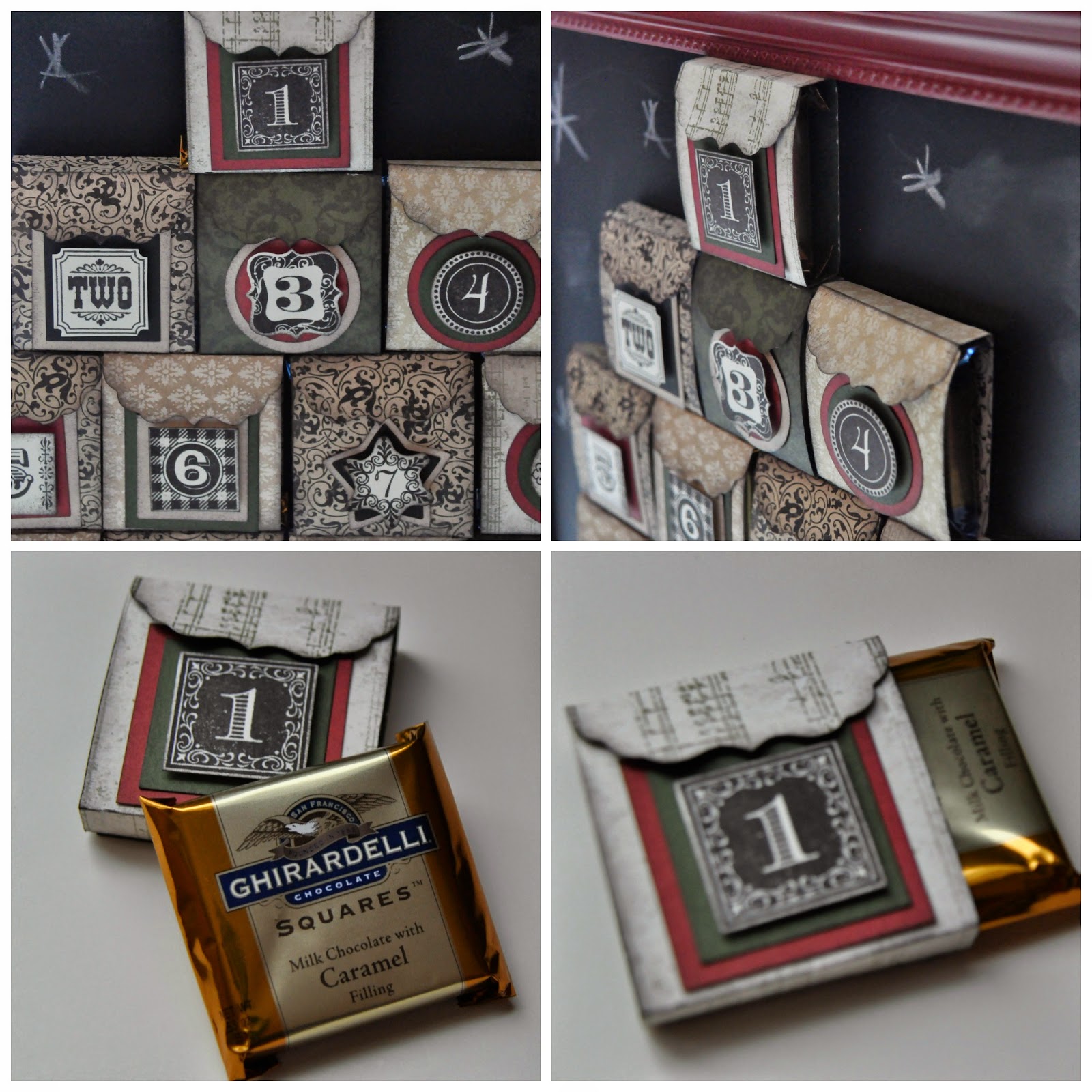 This was a super fun project to work on- it all started because of the chocolate – as do most good ideas. I spotted these Ghirardelli chocolates at Costco and knew I had to find a use for them. Then came the Designed Decor Red Magnetic Chalkboard. I set the chocolates down on the board and played around with them until I figure out what I wanted to create. (there were lots of other thing I should have been doing at that point.) But the end result was an Advent calendar.