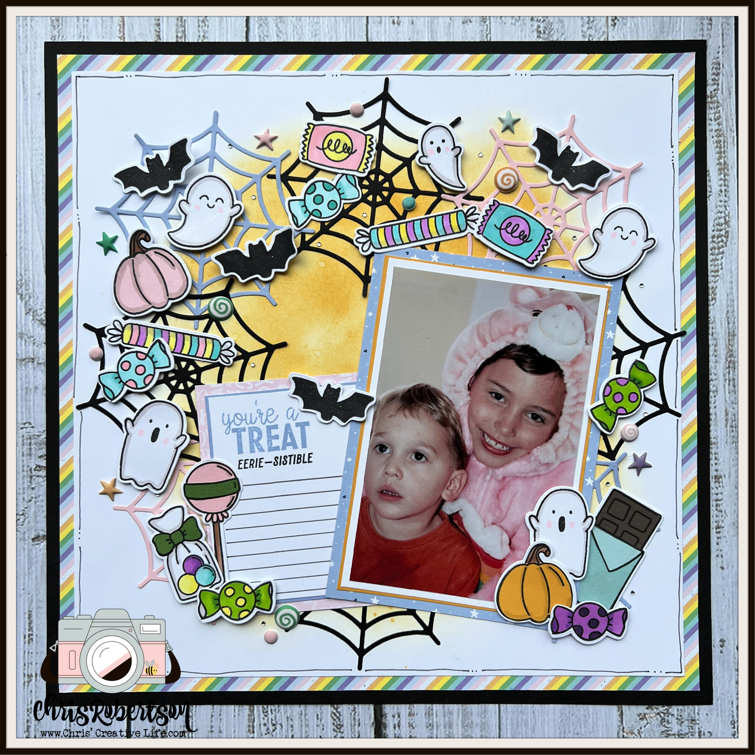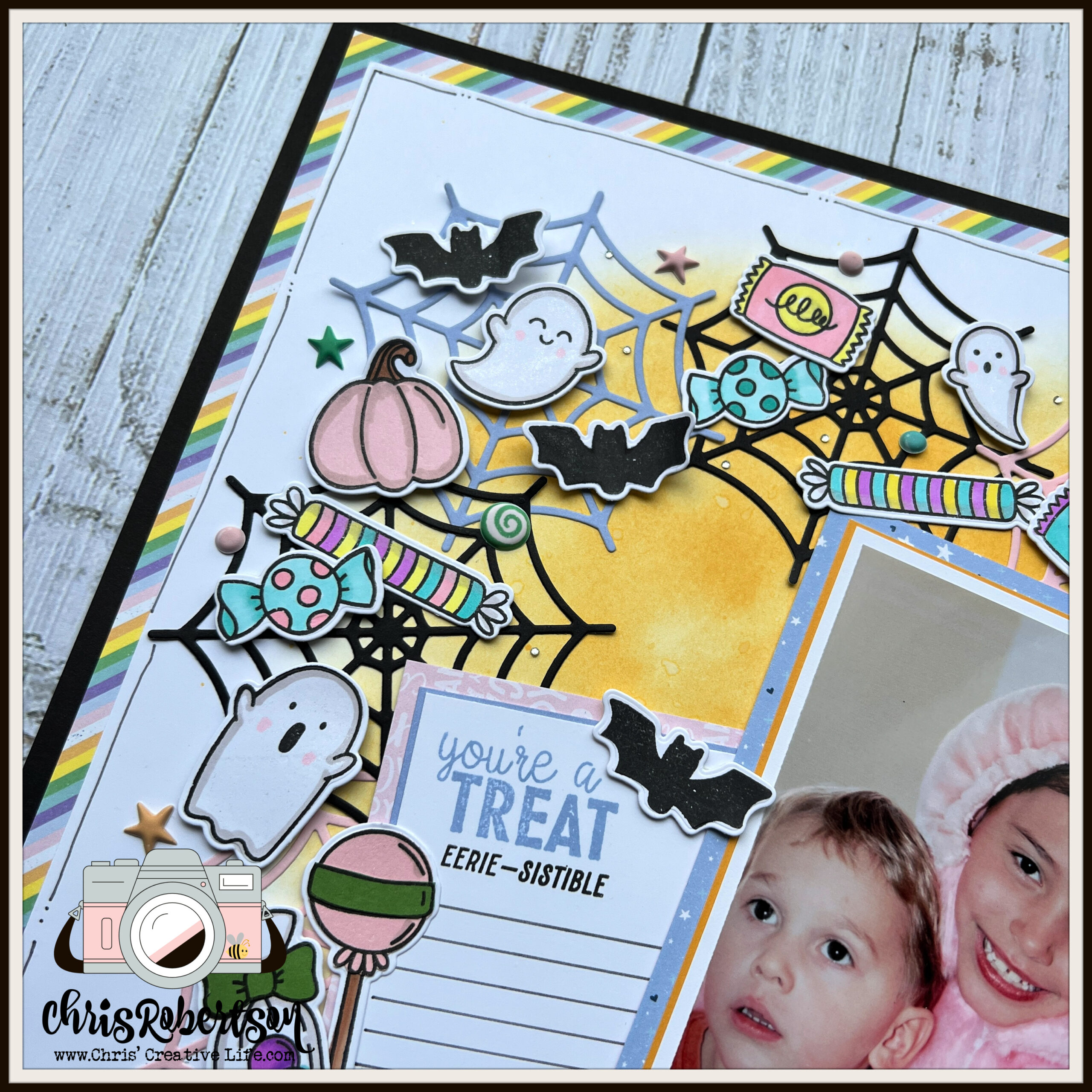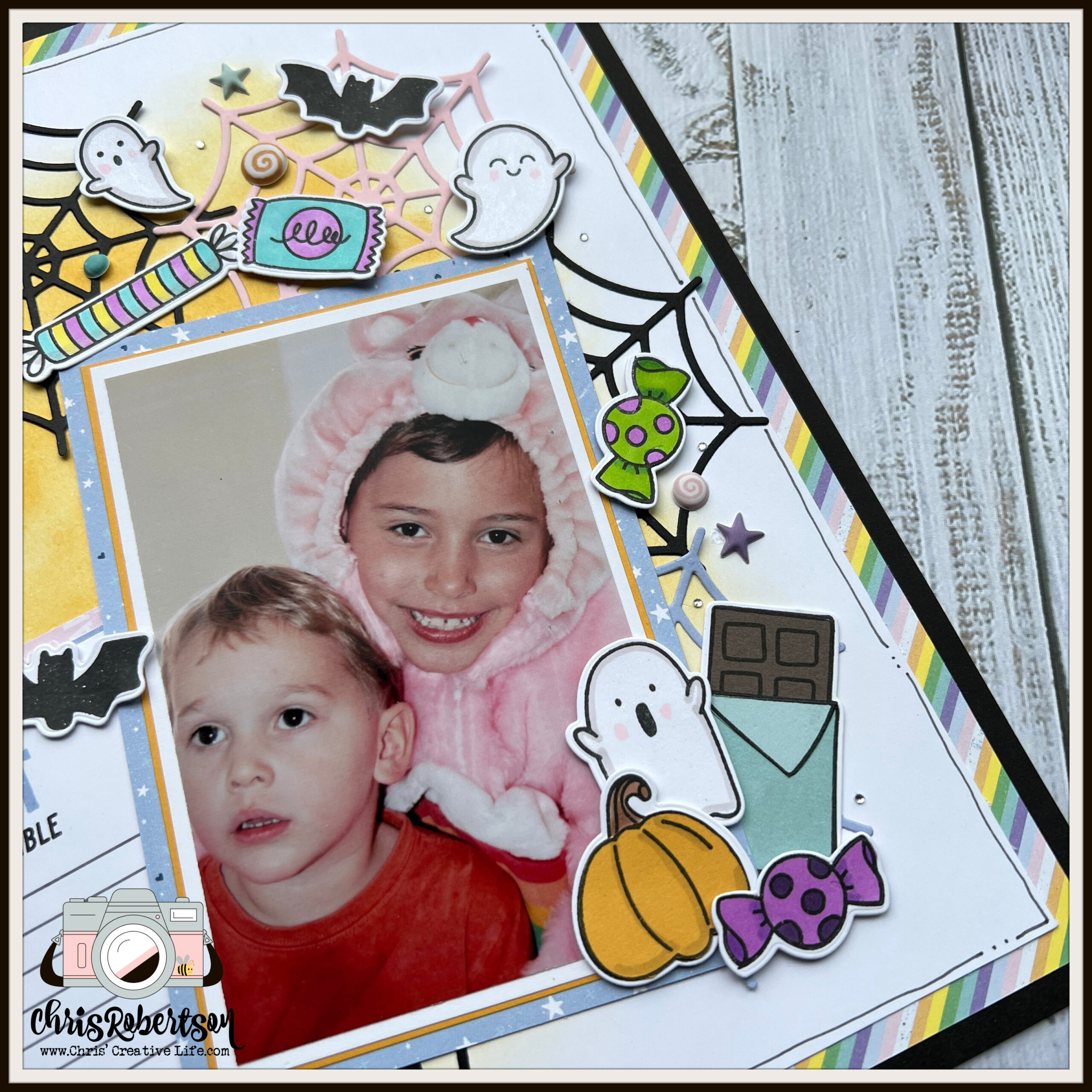 Getting Inspired: The inspiration for this scrapbook layout came from a recent layout I was working on with a Holiday wreath and I thought let’s mash it up with , the enchanting “I Want Candy” collection, and cherished memories from a Halloween in 2003. As I stumbled upon old photos of my kids dressed as a Care Bear and an adorable puppy, the idea to incorporate these precious memories into a Halloween-themed scrapbook layout took shape.
