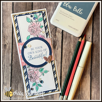 Remember I promised I would post the slimline card that I created last week on my Facebook business page in a live class. It was such a fun class where I used the December SOTM called Happiness Never Grows Old from Close to My Heart. This stamp of the month has a great group of different floral images and a few great sentiments. The Stamp of the Month program is so great, when you have a qualifying order you can purchase it at a discount or even for free! More about that in a bit let’s move onto the card…..