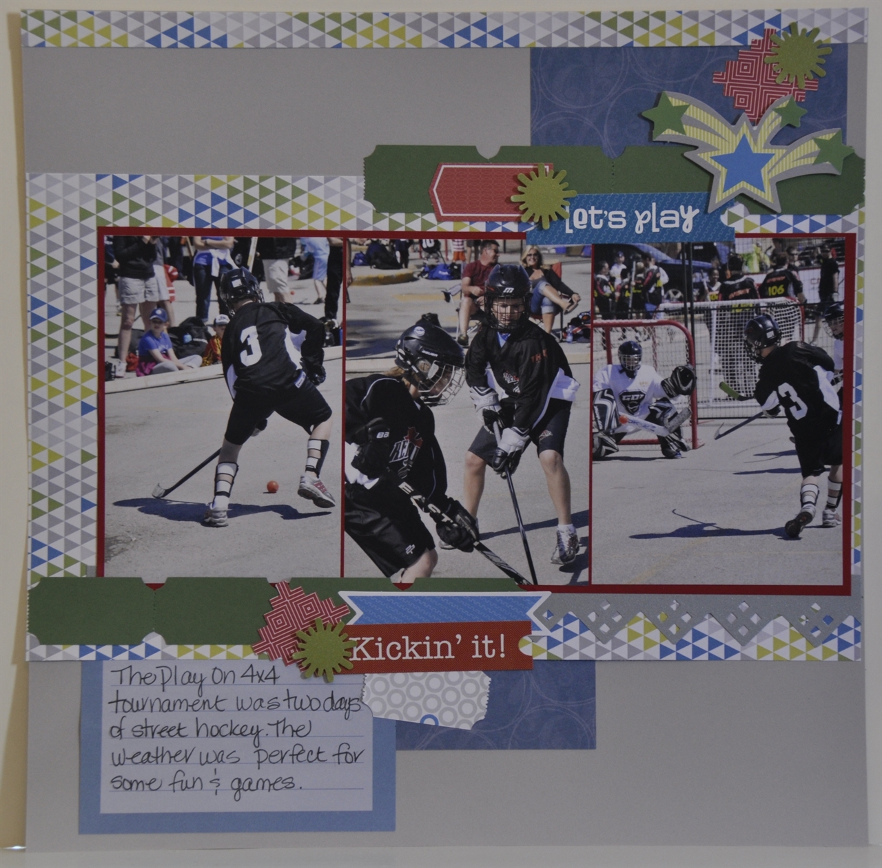 This was an outdoor 4×4 tournament last spring. Let’s just say the boy had some fun. I am quite enjoying playing with the paper stack. There are lots of bright patterns to pick from.