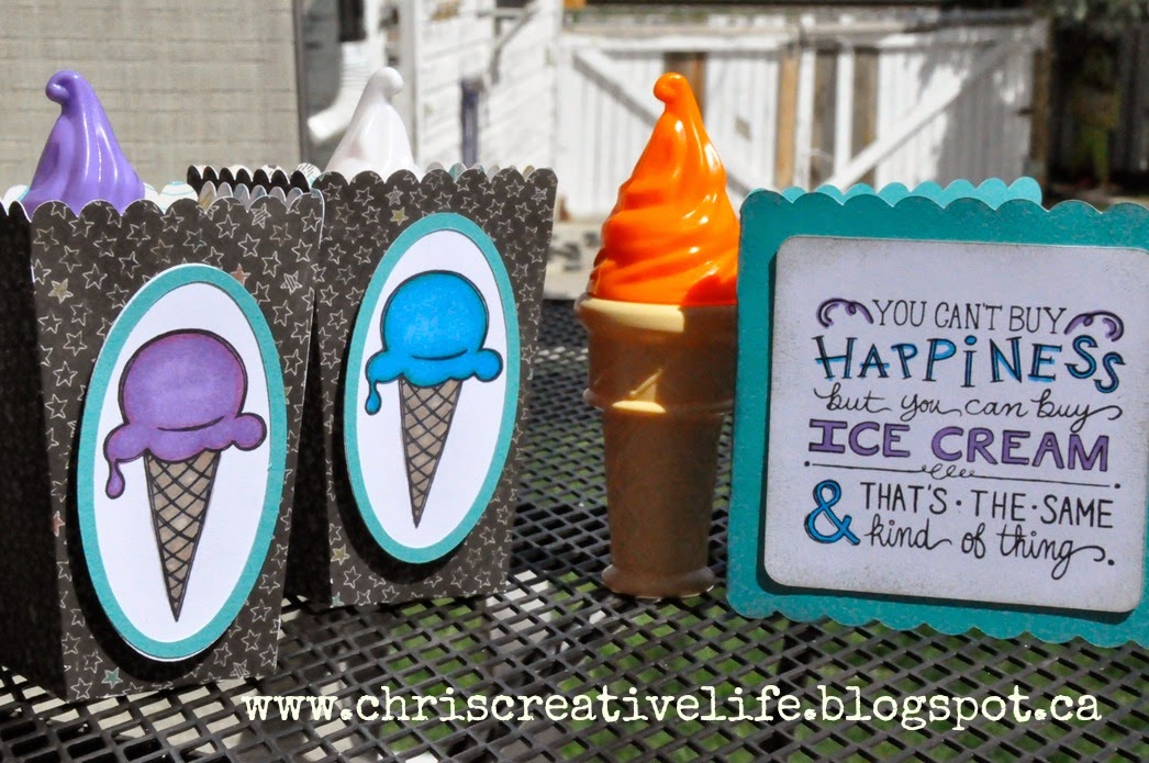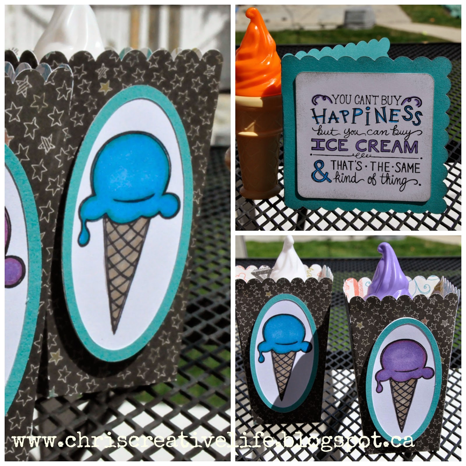I found these super cute ice cream cones with “ice cream” scented bubbles! How fun is that? I thought they would make a great treat for anyone. I packaged the in the popcorn container from the Artiste Cricut cartridge. I stamped the front decoration with the Ice Cream Dream stamp set and coloured with our ShinHan Twin Marker. I created a card with the stamp set to go with the bubbles!