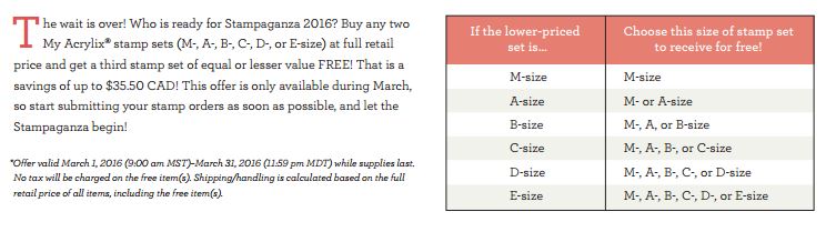 Buy any two My Acrylix® stamp sets (M-, A-, B-, C-, D-, or E-size) at full retail price and get a third stamp set of equal or lesser value FREE! That is a savings of up to $35.50 CAD! This offer is only available during March, so start submitting your stamp orders as soon as possible, and let the Stampaganza begin! Here is the link to start shopping- HERE