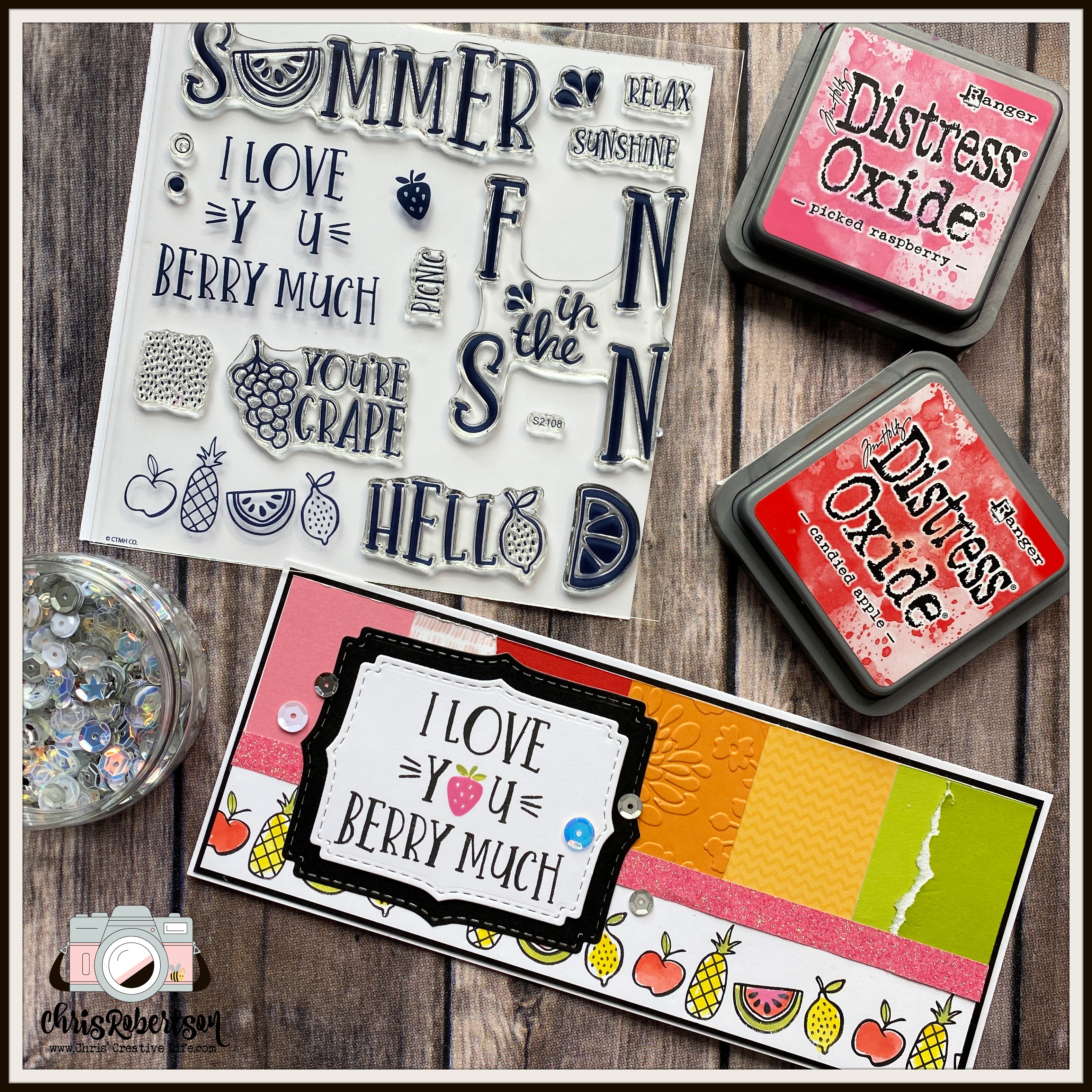 I started the week by trying to find a fun method to do some coloring! I decided I was going to create a slimline card and use our Distress Oxide inks to color the cute fruit themed images. I created the card with a fun summery dare I say…tutti frutti feel 😉 The color palette was Avocado, Nectarine, Candy Apple and Flamingo, with some pops of black to set it all off. I used Picked Raspberry, Mustard Seed, Peeled Paint and Candied Apple Distress Oxides with my small water brush to color all the images. I have to say I also thing the Silver Loose Sequins were the prefect final touch.