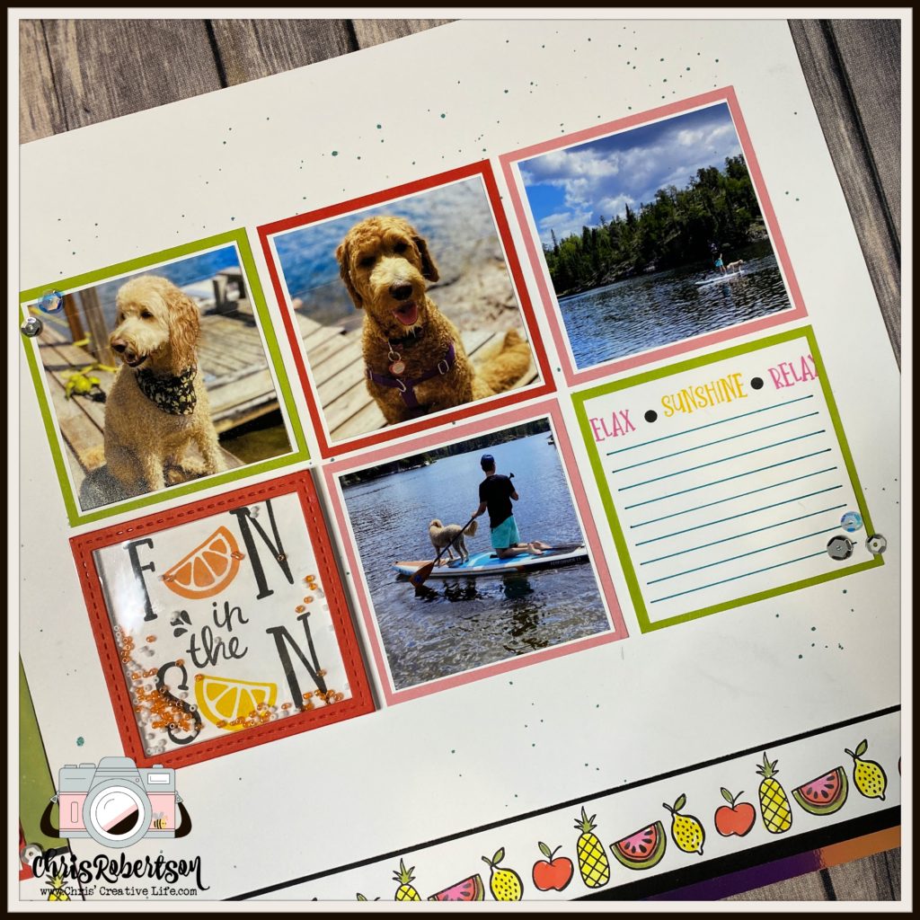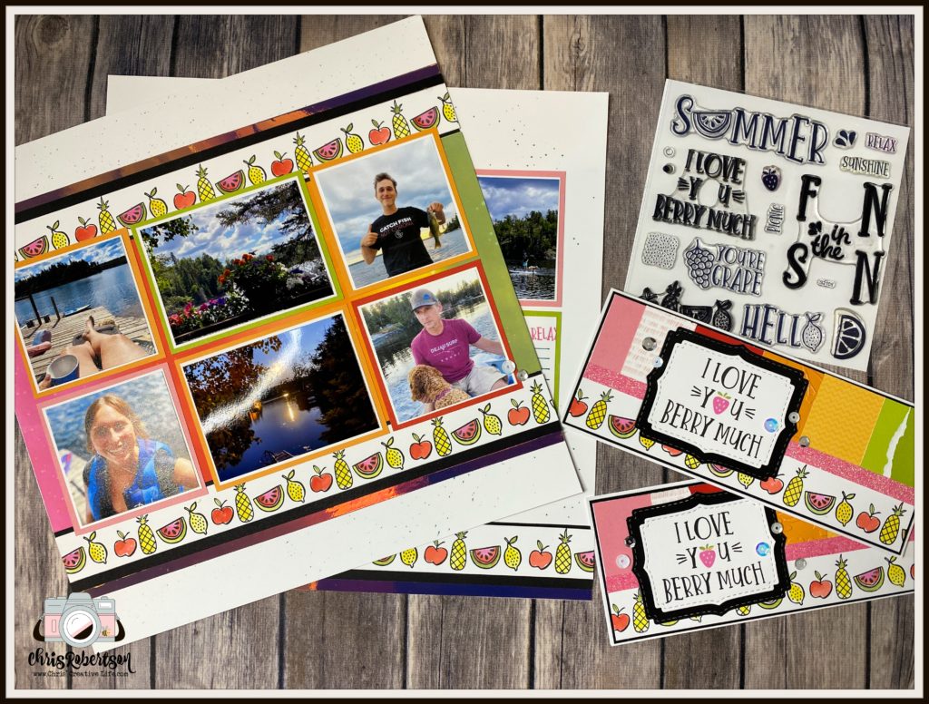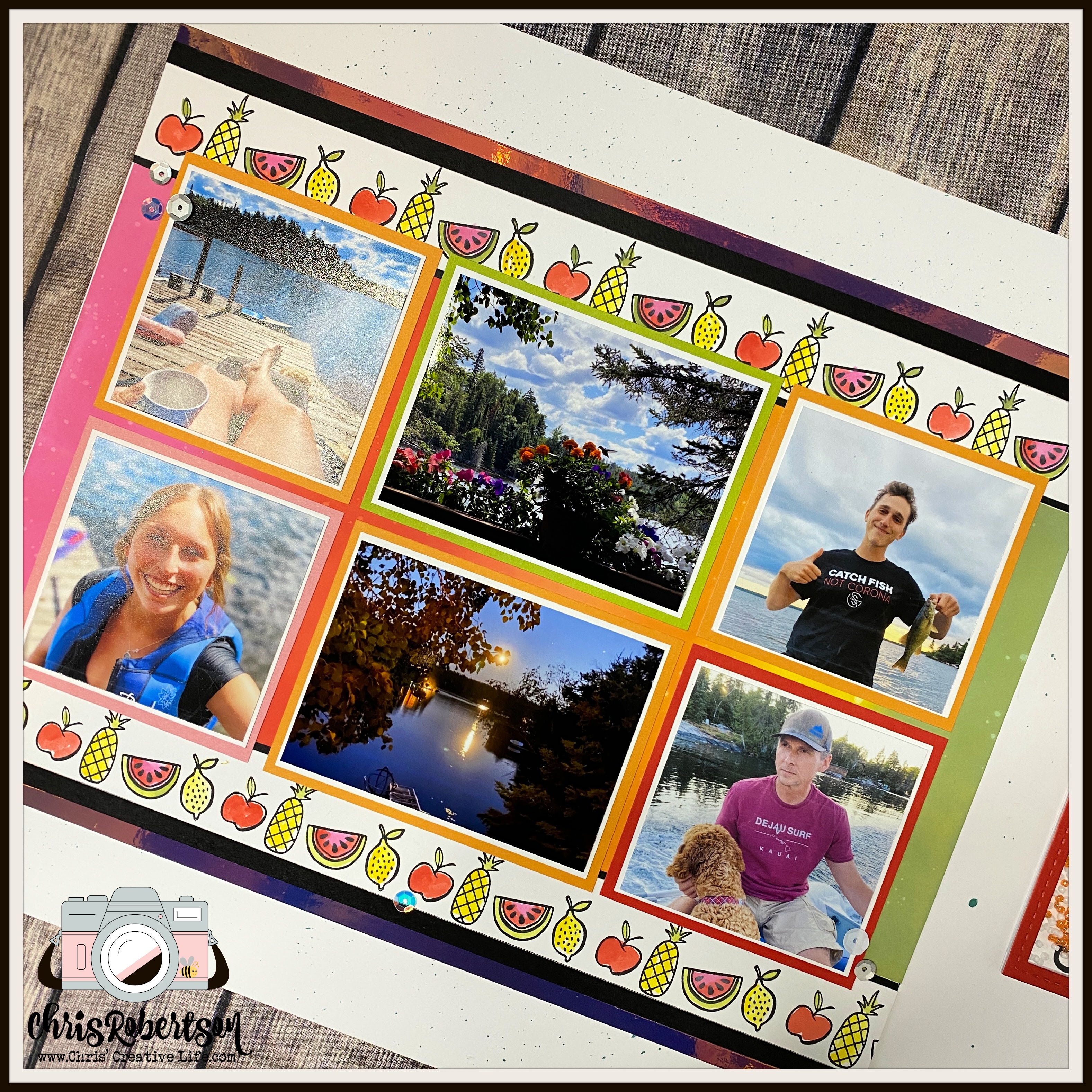 I think that Chris’ Creative Sketch #2 was perfect for this layout. I created the main panel on the left page with Distress Oxide ink. The background is splattered with the Lagoon Shimmer Brush to start the process. The fun fruiti borders are the same as from the card, adding in some Twinkle Toes Holographic paper and black to set it all off.